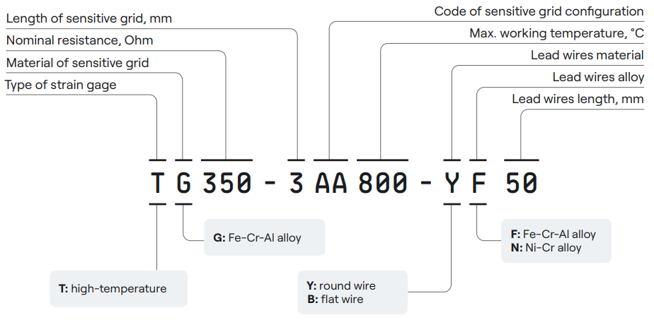 TG series strain gages are produced from iron-chromium-aluminum (Fe-Cr-Al) alloy foil by wet etching process. They are intended for the measurements of static deformations and mechanical tensions in the -269…+800°C (-452...+1472°F) temperature range. Installation of the gages on the test object is done with a special high-temperature ceramic glue, e.g., CC-02.