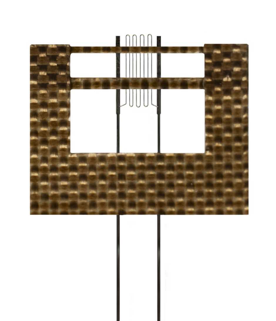 Fe-Cr-Al alloy gages are designed for the use in the widest operating temperature range. These bondable high-temperature wire strain gages are dedicated for measurements of deformations in the details of machinery and equipment, including jet engines, under static and dynamic loads up to +1150°C temperature range. Sensitive grid of the gage is made of 15…30 um diameter iron-chromium-aluminum alloy wire. Sensitive grid is fixed on the fiberglass-reinforced PTFE temporary backing. Lead wires are made of ribbon or round wire with 0.07…0.15 mm diameter. Material of the lead wires correlates with the sensitive grid material and is also iron-chromium-aluminum based.