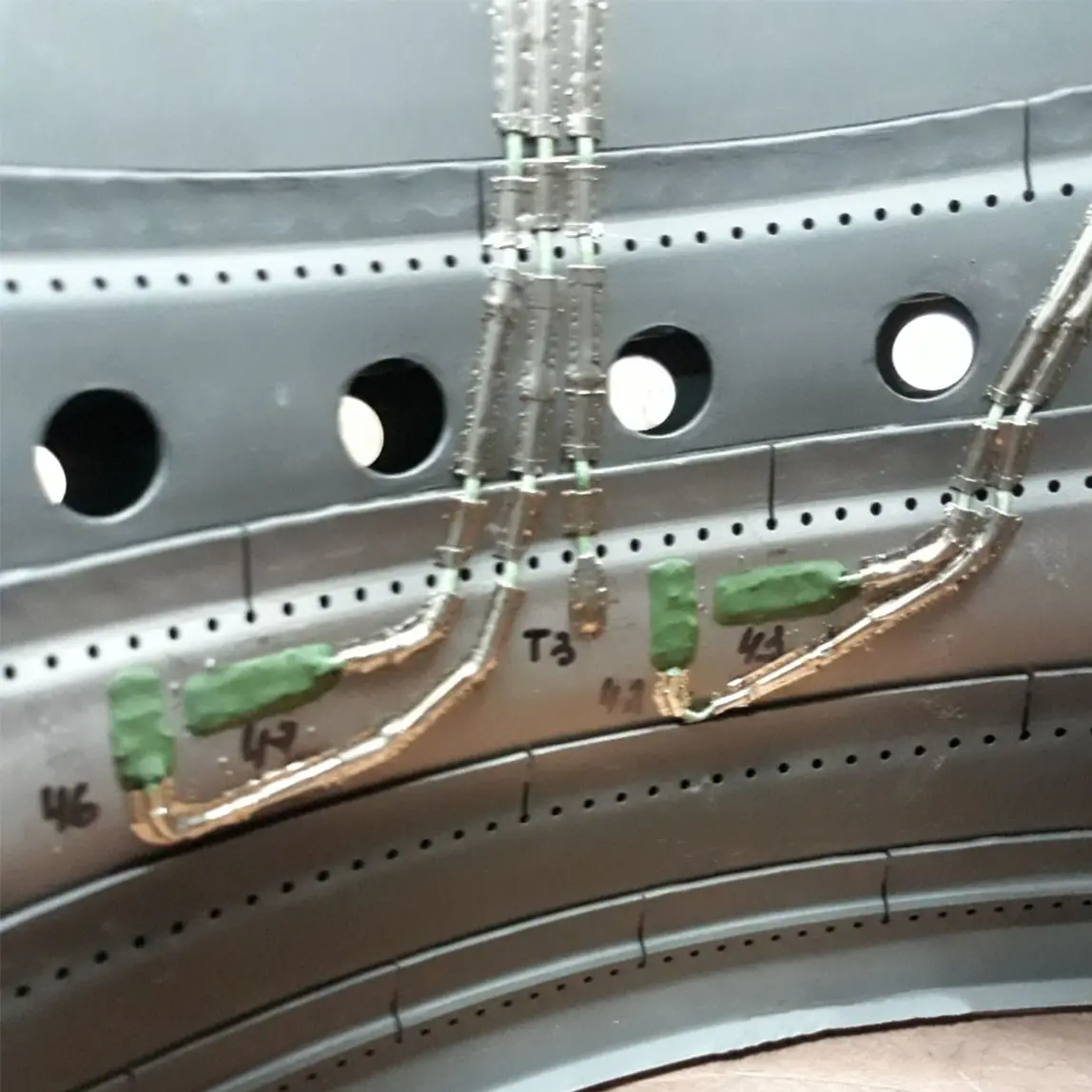 HPM nickel-chromium wire strain gages were installed using VPG HG-1 cement. Elongation cable routes are protected with spotwelded heat-resistant foil. In total, 60 strain gages were used for dynamic test of the combustion chamber.